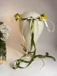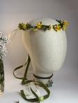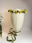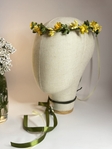 Ніжна воскова гілочка ручної роботи з жовтими квітами, доповнена зеленою тичинкою, що надає природного та яскравого вигляду. Композиція виглядає свіжо та весело, ідеальна для весіль, фотосесій, урочистих подій або як декоративна прикраса для волосся. Гілочка з жовтих квітів і зелених тичинок підкреслює яскравість, радість та природну гармонію образу.