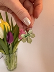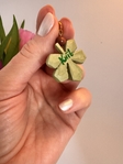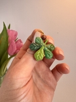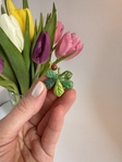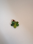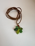 Етно підвіска на шию у формі каштанового листочка з полімерної глини. Кожна прикраса виготовлена та розписана вручну, розмір листочка — 3 см. Доповнена намистинкою з натурального каменю та якісною біжутерною фурнітурою сріблястого або золотистого кольору. Унікальна прикраса з природним характером.