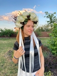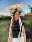 Темні ягоди гармонійно доповнюють композицію, додаючи контрасту та оригінальності. Віночок прикрашений довгими атласними стрічками кремового і білого кольорів, які плавно спадають уздовж волосся, надаючи образу елегантності і романтики.