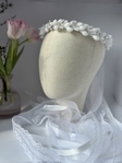 Довгі білі та мереживні стрічки додають образу легкості, романтики та святковості, красиво спадаючи по волоссю і підкреслюючи ніжний образ нареченої. Такий віночок ідеально підходить для весільної церемонії, фотосесії або традиційних українських обрядів.